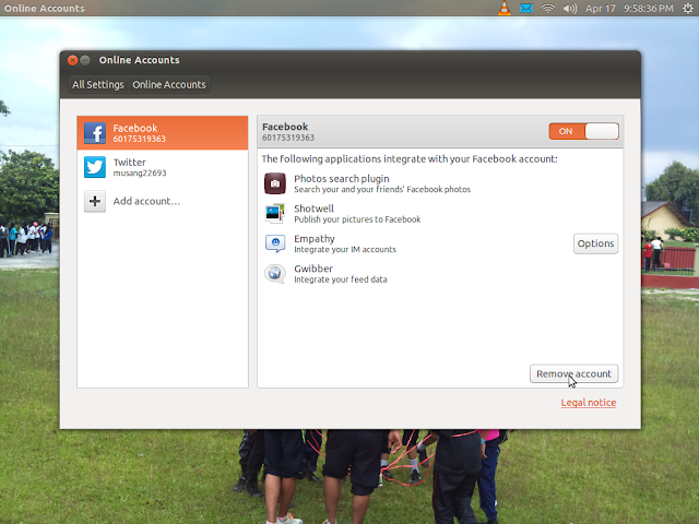 Dalam gambar tu memang dah ada dua akaun sebab Mus memang dah daftar akaun tuk facebook dan twitter. Anda boleh buat pilihan nak daftar akaun apa untuk digunakan oleh Gwibber. Selain itu, terdapat juga aplikasi2 lain yang turut menyokong perkhidmatan Online Account ini. Dalam tutorial ni, Mus akan cuba tambah akaun facebook untuk "integrate" dengan Gwibber.