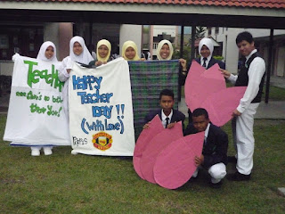 Maafkan saya kerana terlewat untuk menghantar laporan tentang Hari Guru yang berlansung di sekolah saya(SMK Aminuddin Baki Chemor). Pada dua hari sebelum Hari Guru, saya sememangnya tidak sabar dengan kehadiran hari tersebut. Ini juga kerana ibu saya sendiri adalah seorang guru di SMK Jati, Ipoh dan beliau berkhidmat sebagai seorang Guru Kanan Teknik & Vokasional di sekolah tersebut. Secara tidak disangkakan, sahabat sekelas saya, Fazirin berjumpa dengan saya dengan tergesa-gesa. Beliau menyatakan bahawa PERPIS(Persatuan Pelajar Islam) telah melantik saya sebagai "Latar Suara" untuk persembahan mereka pada Hari Guru. Semuanya menjadi kelam-kabut disebabkan oleh sedikit masalah yang dihadapi semasa sesi pemilihan persembahan sebelum Hari Guru akan dilangsungkan. Saya pada masa itu(masih terkejut), menerima tawaran tersebut dengan hati yang terbuka kerana saya juga teringin menyumbangkan jasa kepada PERPIS(ketawa). PERPIS diterima untuk membuat persembahan pada Hari Guru dan kami semua amat bersyukur akan hadrat Illahi yang memberi kesempatan kepada kami untuk mempersembahkan persembahan yang tidak seberapa hebat berbanding dengan persatuan-persatuan lain yang mempersembahkan persembahan yang bagi saya lagi menarik daripada kami.